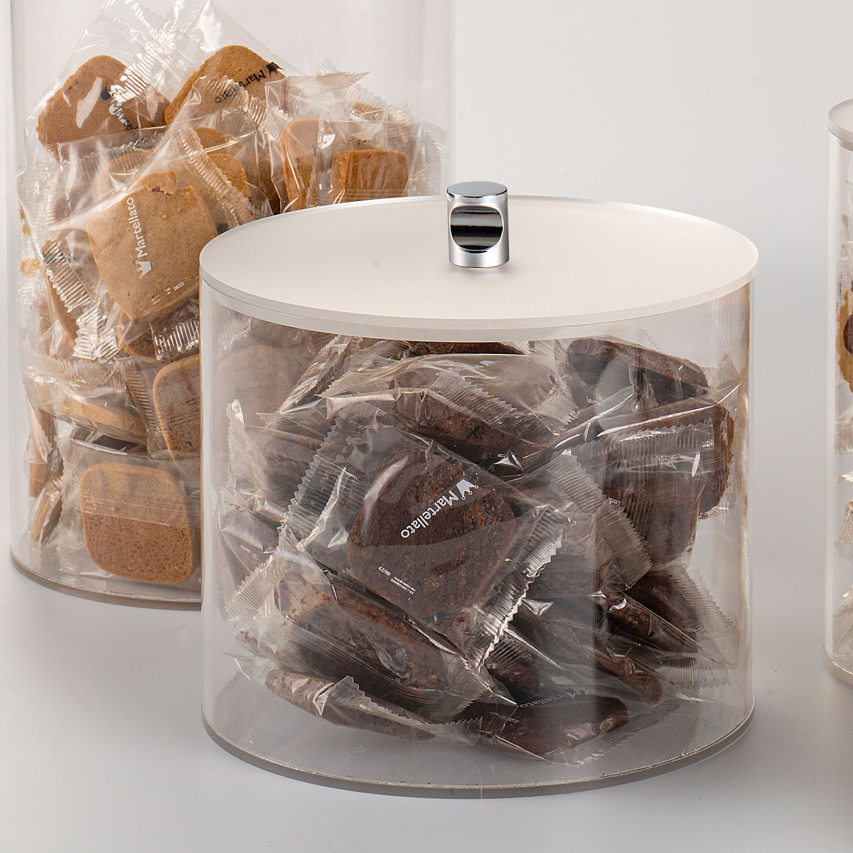 Contenitore con mezzo coperchio ruotabile.